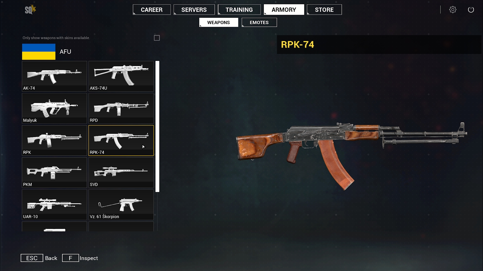 TLF 游戏图层 巴士拉 • 入侵 v9 - TLF vs INS 铁砧 • RAAS v5 - TLF vs RGF 黑海岸 • 入侵 v6 - TLF vs RGF • RAAS v6 - TLF vs PLA • 种子 v2 - TLF vs VDV Chora • AAS v7 - TLF vs MEA 费卢杰 • 入侵 v7 - TLF vs INS • RAAS v8 - TLF vs INS • 种子 v2 - TLF vs MEA 戈罗多克 • 入侵 v4 - TLF vs IMF • RAAS v13 - TLF vs VDV Kohat • 入侵 v5 - TLF vs INS • RAAS v5 - TLF vs IMF • RAAS v11 - TLF vs RGF Lashkar • 入侵 v5 TLF vs PLA Logar • AAS v4 - TLF vs IMF Mutaha • 入侵 v5 - TLF vs MEA • RAAS v8 - TLF vs 美国 Sumari • RAAS v3 - TLF vs INS • 种子 v4 - TLF vs 美国 塔利尔郊区 • 入侵 v6 - TLF vs MEA • RAAS v9 - TLF vs PLA 叶霍里夫卡 • 入侵 v5 - TLF vs RGF • RAAS v15 TLF vs VDV 武器皮肤 武器皮肤是基于现实的装饰品,不会影响游戏玩法。 皮肤只能由某些派系装备,并且受到生物群落的限制,以保持游戏的真实性。 这些物品可以在自定义屏幕上装备,可以从主菜单访问。 Woodland Warfare Pack(4.99 美元) 包含三件可在林地地图上使用的装饰品